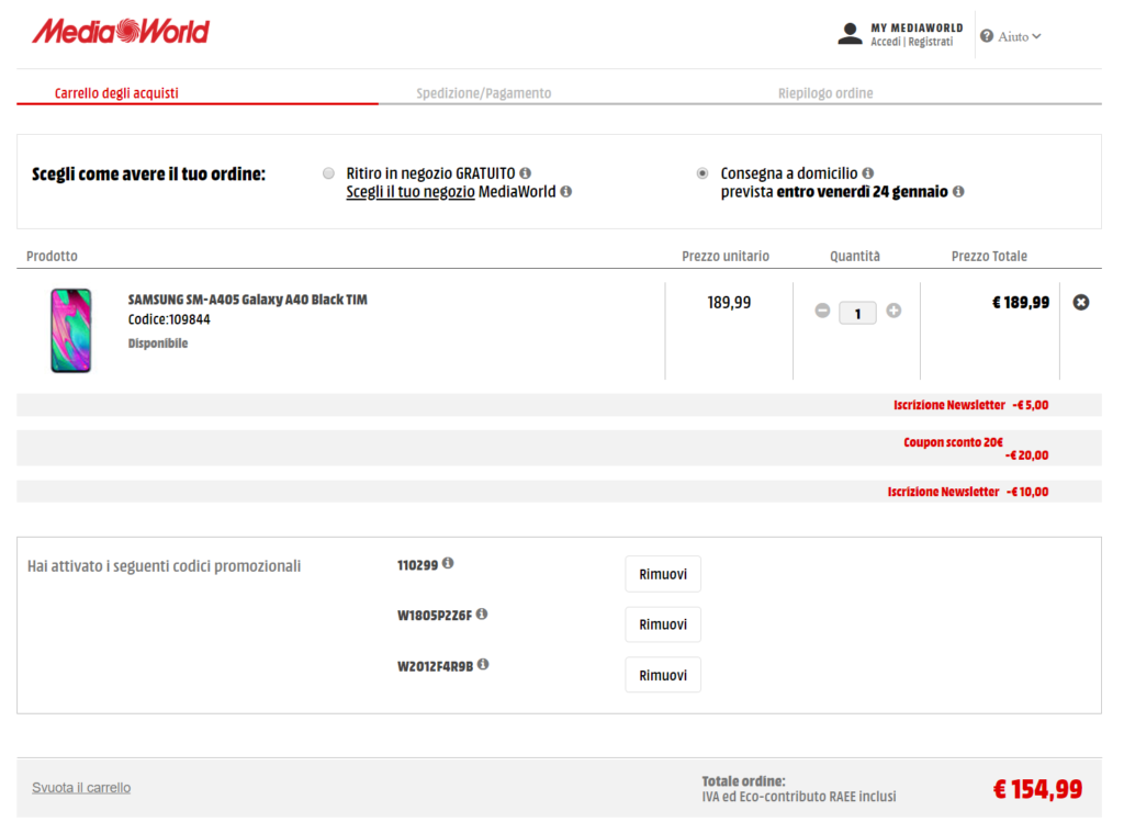 Aggiungi il prodotto al carrello ed inserisci uno per volta i 3 codici sconto cliccando sulla scritta “Clicca qui se hai un codice promozionale”.