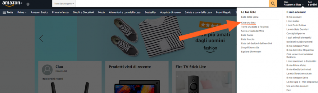 2. Passa il mouse su “Account e liste” sotto il tuo nome e clicca su “Crea una lista”