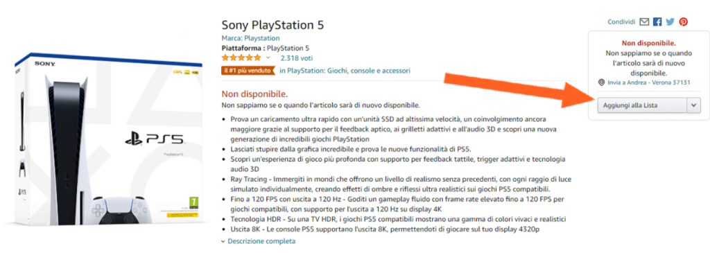 Cerca un prodotto qualsiasi su Amazon e clicca su “Aggiungi alla Lista”