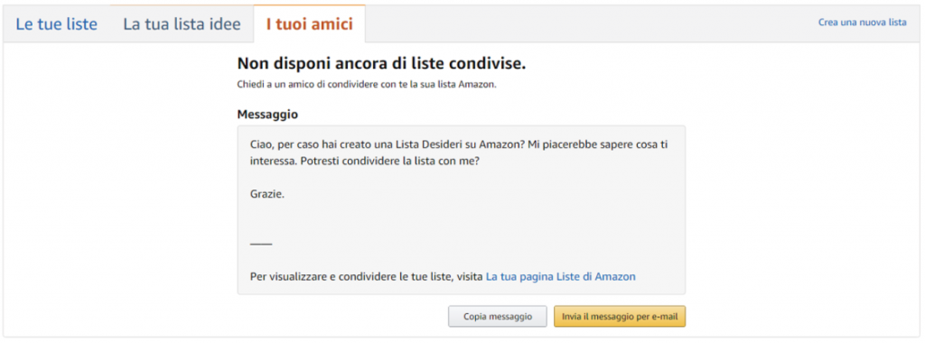 Se invece vuoi chiedere a un amico o parente di condividere la sua lista, dovrai cliccare su “I tuoi amici” in alto e inviare un messaggio (personalizzabile) per email.