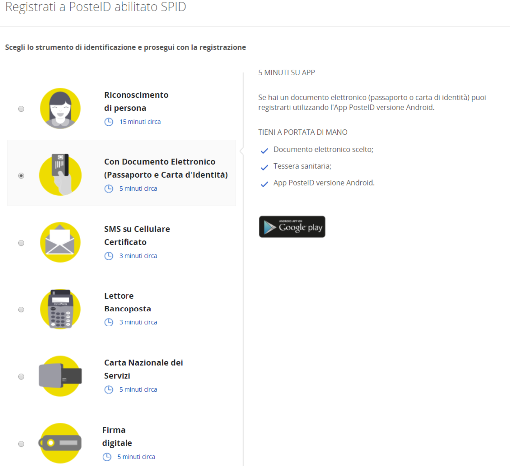 Ti verrà richiesto un documento di riconoscimento ufficiale a scelta come la Carta d’Identità Elettronica, Passaporto Elettronico, Cellulare Certificato, Firma digitale o Carta Nazionale dei Servizi.