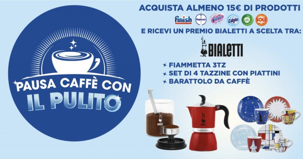 Partecipa al nuovo concorso “Pausa caffè con il pulito” e richiedi il premio sicuro Bialetti che preferisci tra i 3 a disposizione.