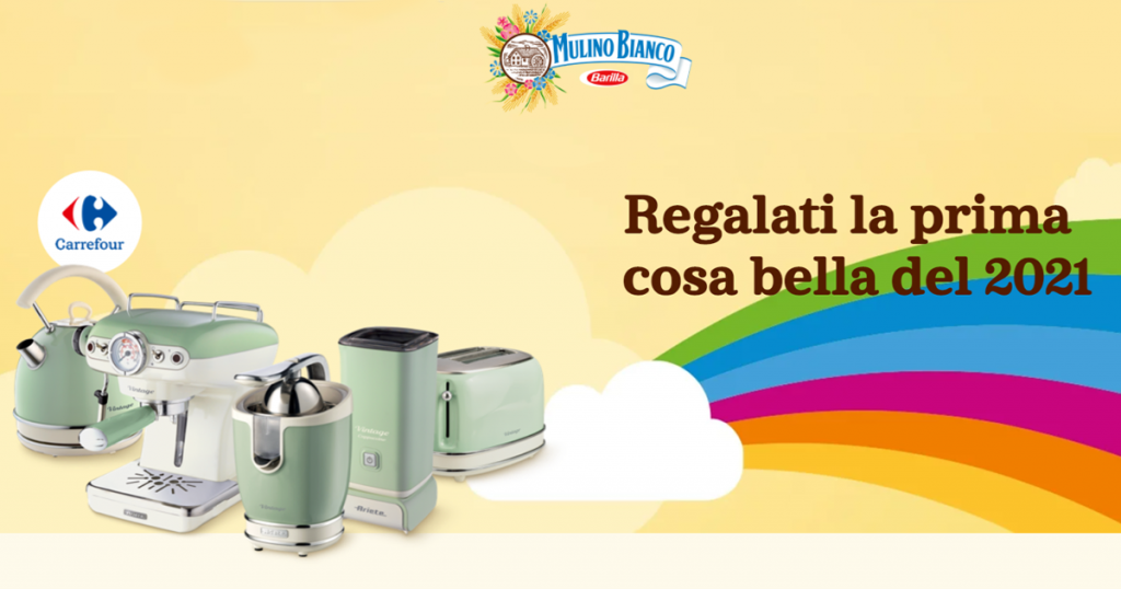 Per partecipare al concorso Mulino Bianco e vincere il set di elettrodomestici Ariete, recati in un supermercato Carrefour e acquista fino al 30 aprile almeno due confezioni tra i prodotti Mulino Bianco, Grancereale o Pan di Stelle.