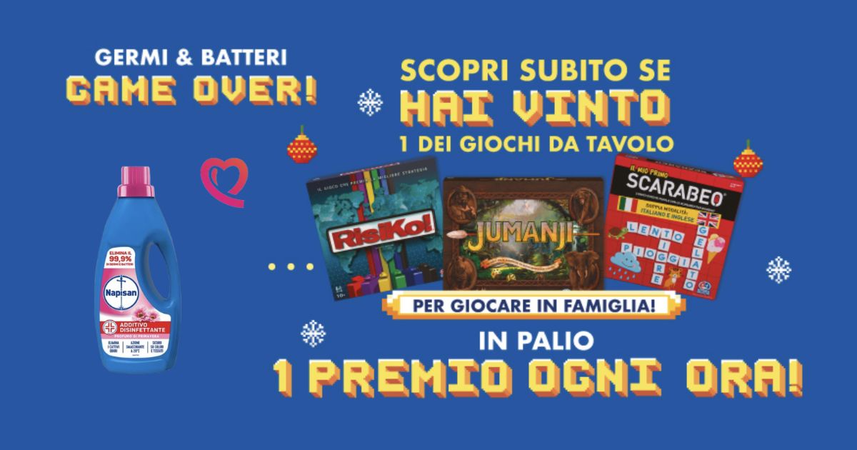 Sei un amante dei giochi di società? Allora non perderti il nuovo concorso “Germi & Batteri Game Over!”: con la tua spesa di Additivo Napisan potrai aggiudicarti uno dei 448 giochi da tavolo per divertirti con amici e famiglia.