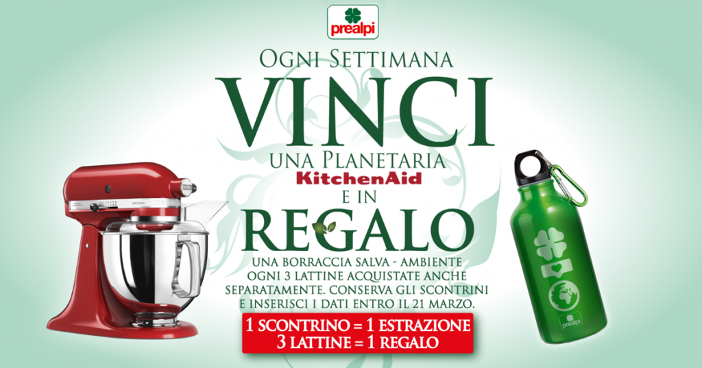 Inoltre, con un solo prodotto puoi partecipare anche per l’estrazione ad instant win della planetaria KitchenAid! In questo caso, basta l’acquisto di una sola confezione Prealpi!