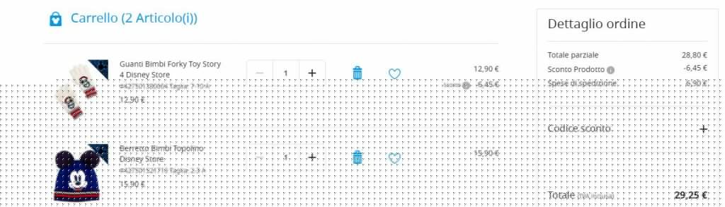 Ecco che i guanti, essendo il prodotto più economico tra i due, vengono scontati della metà! In questo caso si applicano le spese di spedizione, perché abbiamo fatto un carrello da meno di 50€. Se vuoi evitarle, assicurati di raggiungere i 50€ di spesa pre-sconto.