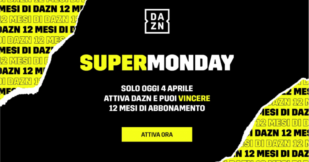 Con il nuovo concorso “SuperMonday”, dedicato a tutti coloro che amano lo sport, DAZN dà in regalo 100 abbonamenti annuali. Infatti, se nella giornata di oggi, lunedì 4 aprile 2022, ti abboni a DAZN o riattivi un tuo account in precedenza disdetto, puoi aggiudicarti uno dei 100 abbonamenti annuali messi in palio.