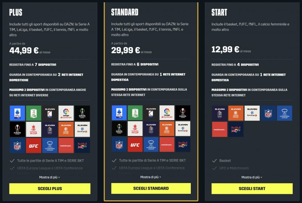 Il piano DAZN Standard non cambia nelle caratteristiche rispetto al passato.