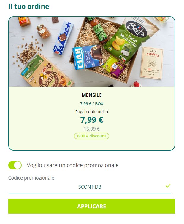 Per usufruire dello sconto basta cliccare qui e controllare che il codice sia regolarmente inserito come nell’immagine sottostante!