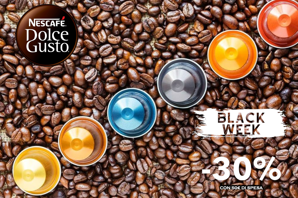 Per la Black Week, anche Nescafé Dolce Gusto offre degli sconti molto interessanti: acquistando almeno 50€ di capsule Nescafé nei formati x12 e x16, avrai uno sconto immediato del 30%.