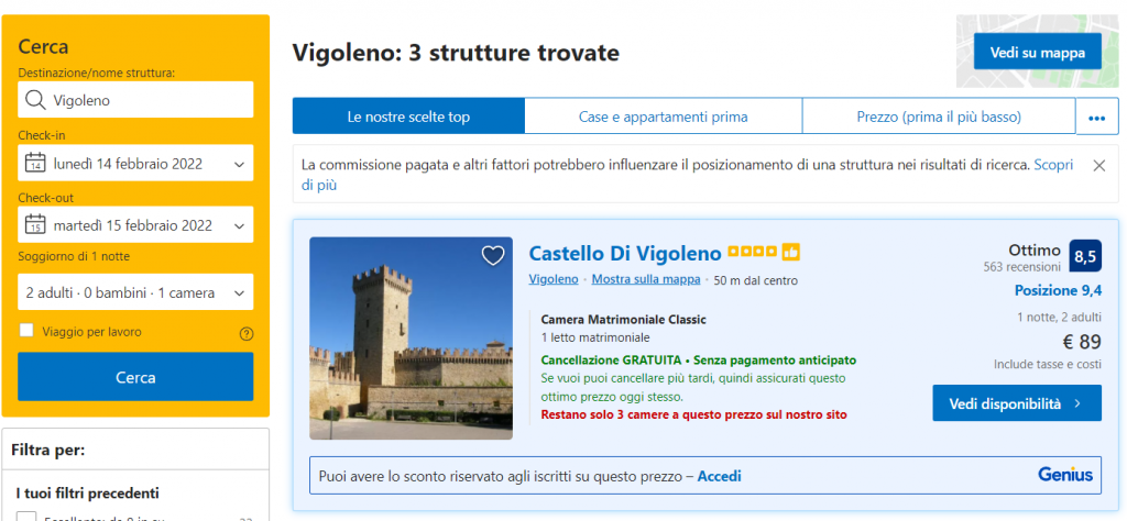 Di seguito proponiamo alcune date interessanti per passare una notte romantica nel castello di Vigoleno. Segnaleremo il prezzo più basso, in offerta con cancellazione gratuita e senza colazione, ma una volta aperto il link vedrai tutte le opzioni, anche per le suite superiori.