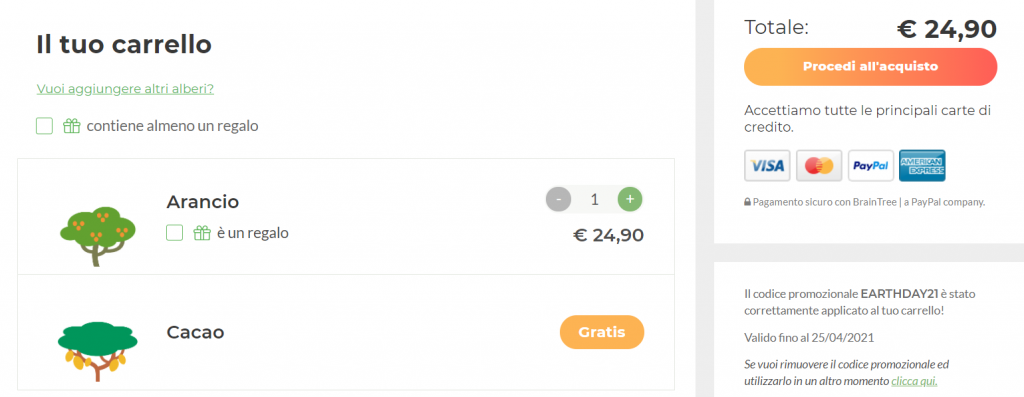 Entra su Treedom e provaci subito anche tu. Guarda le seguenti immagini! Con il codice sconto si è aggiunto da solo un albero di cacao, nel nostro caso.