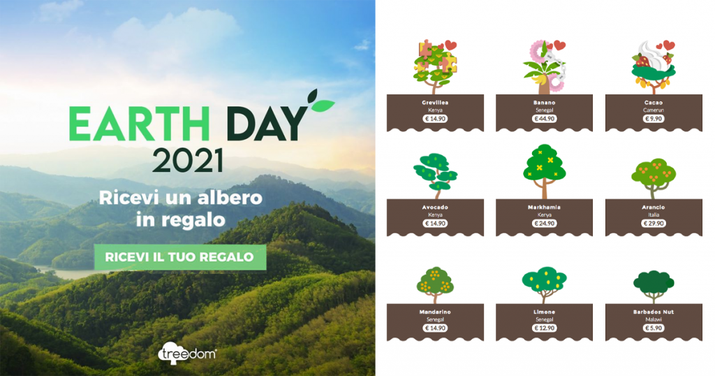 Per la Giornata Mondiale della Terra, l’Earth Day 2021 (22 aprile), Treedom regala un albero aggiuntivo per ogni albero piantato.