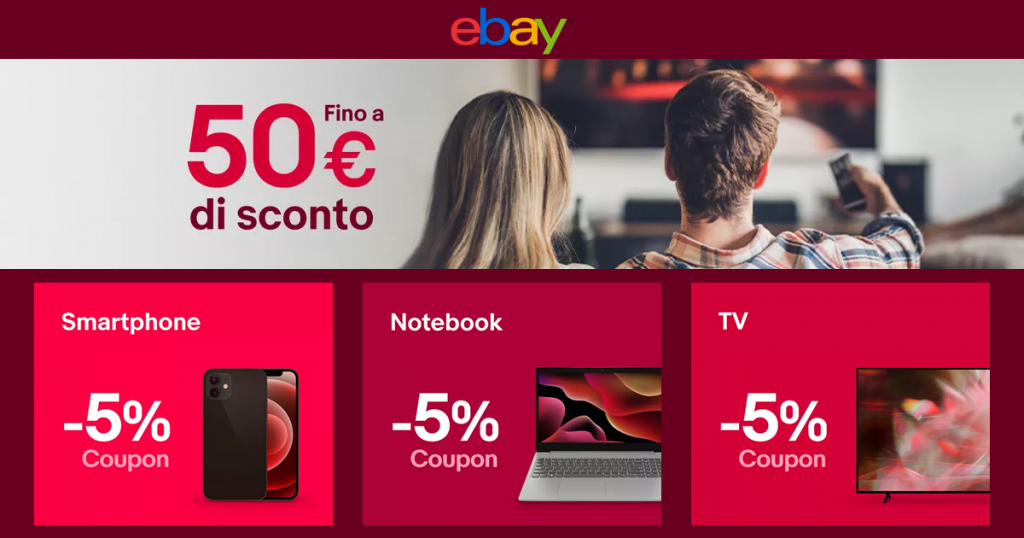 eBay offre un nuovo coupon tech, che ti permette di acquistare smartphone, notebook e TV con un risparmio del 5%, fino a 50€ di sconto massimo!