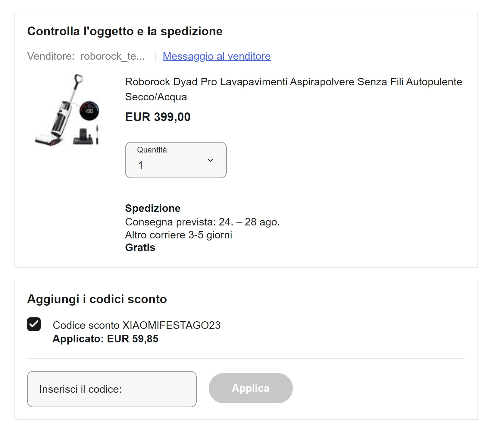 Qui dovrai inserire un metodo di pagamento valido e spuntare la casella “Codice sconto XIAOMIFESTAGO23” nell’area Aggiungi i coupon (come in foto).