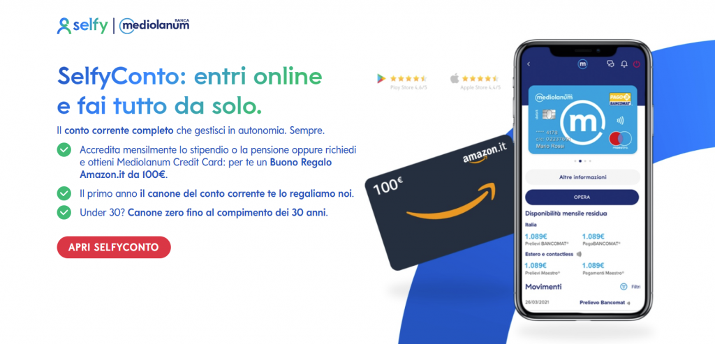 SelfyConto è il nuovo conto corrente tutto online di Banca Mediolanum che ti offre vantaggi unici con canone gratis per gli under 30 e per i nuovi iscritti. In più, chi si iscrive ora riceve un buono da 100€ a scelta (Amazon, Q8, Zalando, ecc.)!