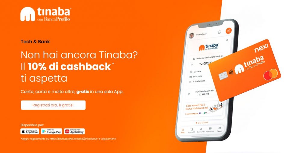 Scarica l’app di Tinaba, apri un conto corrente come nuovo utente e, potrai beneficiare per i 30 giorni successivi all’attivazione, di un Cashback del 10% sulle tue spese con carta.