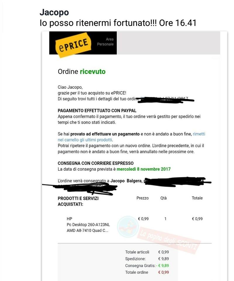 Ieri però, alquanto miracolosamente dato che ad oggi sempre essere un caso singolo, il nostro utente Jacopo è riuscito a portarsi a casa un PC Desktop a soli 0,99€, postando tutti gli screen della transazione sul nostro gruppo generando una discussione con oltre 300 commenti: