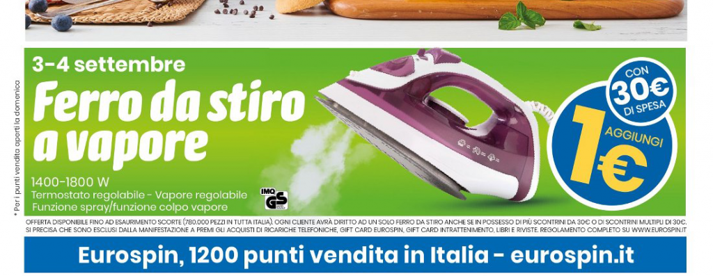 Solo venerdì 3 e sabato 4 settembre 2021, da Eurospin puoi approfittare di un’occasione unica: per te il Ferro da stiro a vapore in omaggio con la tua spesa (aggiungendo solo 1€ in più)!
