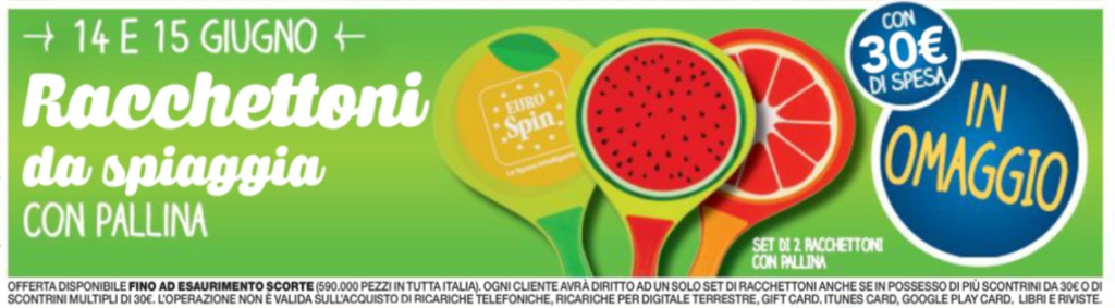 Venerdì 14 e Sabato 15 giugno 2019, fai spesa da Eurospin e, con minimo 30€, ottieni in omaggio i racchettoni da spiaggia e pallina!