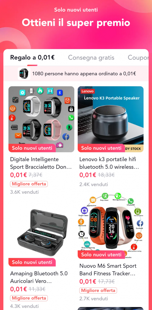 Si tratta di un’app e-commerce, disponibile su Android e Apple, che offre prodotti di vario genere (come capi d’abbigliamento, elettronica ed oggettistica per la casa) a prezzi ultra-vantaggiosi, comprese spedizioni sempre gratuite. L’app ricorda molto i suoi competitor cinesi (Wish, Aliexpress, ecc.), ma azzarda ulteriormente con prezzi ancora più bassi e una qualità che sembra essere leggermente migliore.