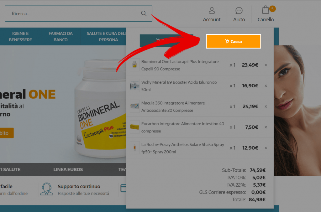 Accedi dunque alla cassa spostando il cursore del mouse sull’icona della borsa della spesa e poi su “Cassa”.