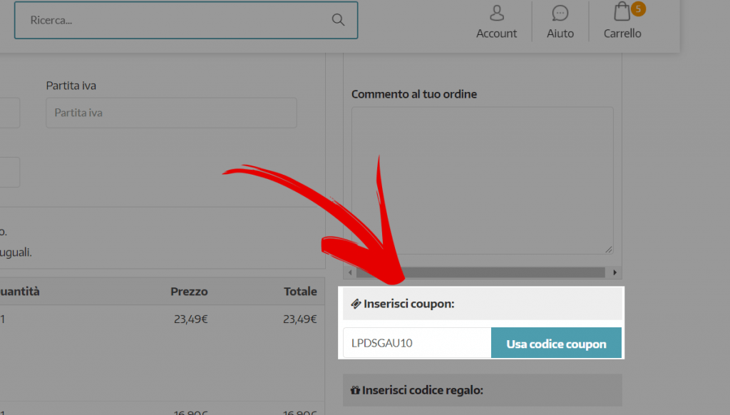 Inserisci dunque il codice sconto più adatto al tuo ordine e clicca su “Usa codice coupon”.