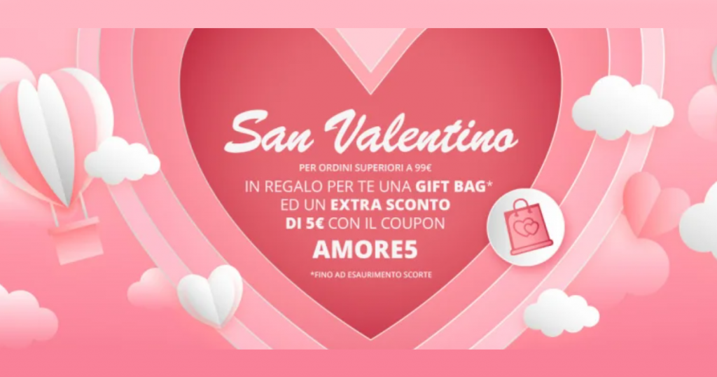 Al raggiungimento dei 99 euro nel carrello, potrai inserire il codice sconto AMORE5per avere un extra-sconto di 5 euro.