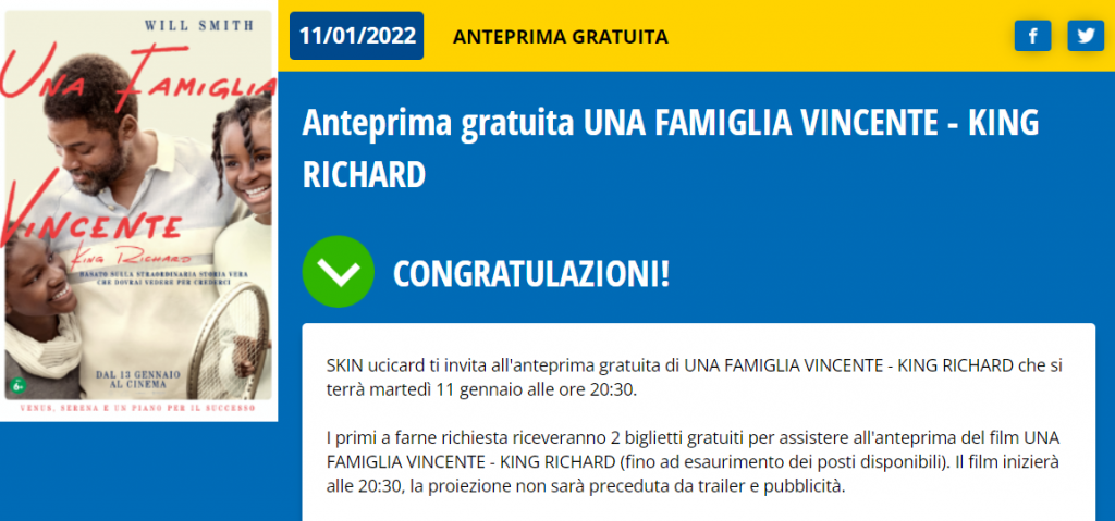 Film GRATIS all’UCI Cinemas: richiedi 2 biglietti omaggio di «Una famiglia vincente» con Will Smith per martedì 11 in tutte le sale!