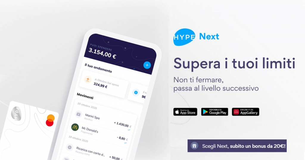Scegliendo di attivare Hype Next, hai a disposizione ora un codice promo che ti regala 20€ di bonus da utilizzare subito. La promozione ha una validità limitata quindi conviene affrettarsi per attivare subito il conto Hype Next.