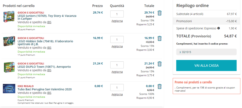 3. Nel carrello, clicca su “Inserisci codice promozionale” ed inserisci il codice D21S15 per ottenere un ulteriore sconto di 15€