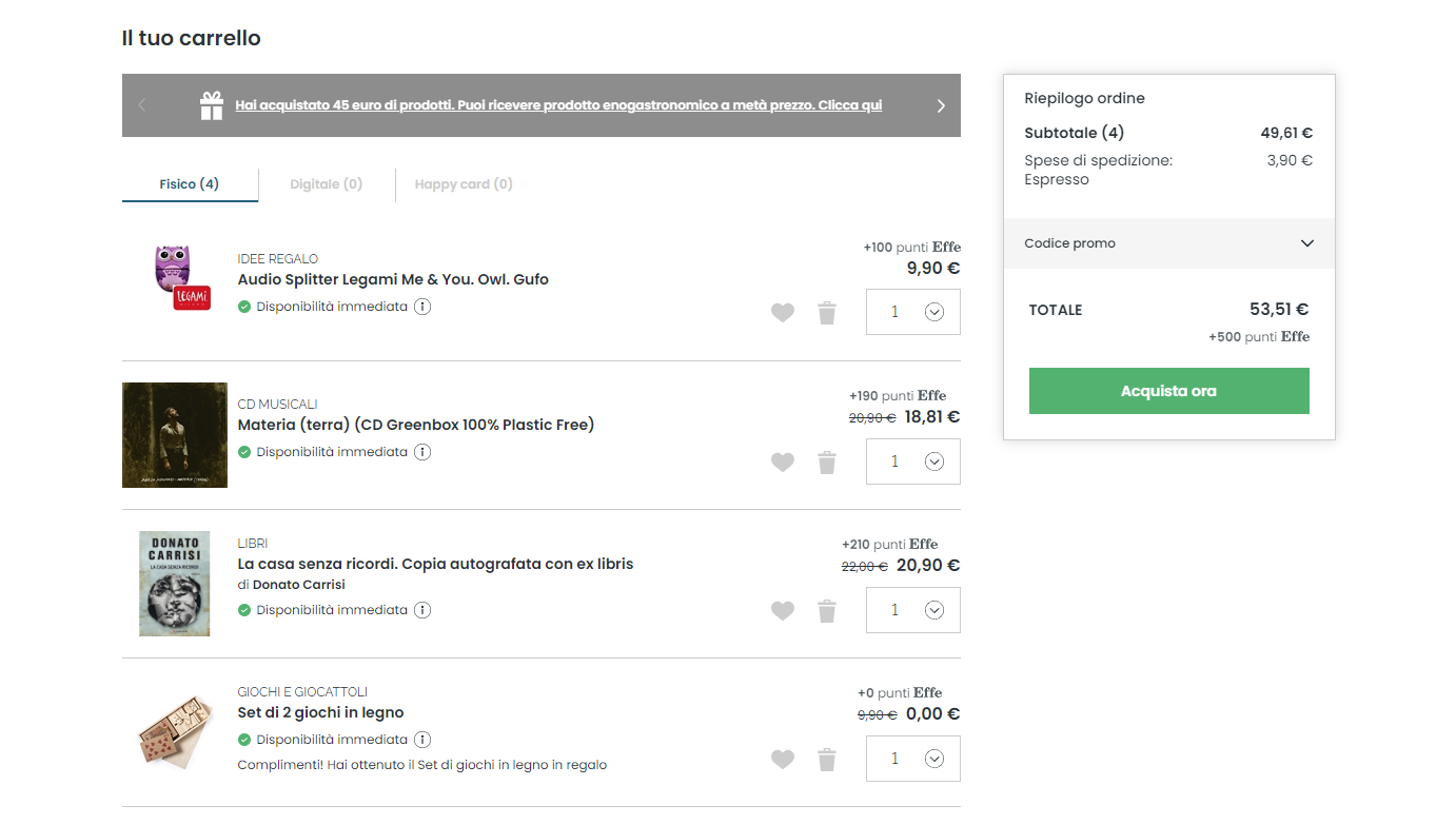 Accedi ora al carrello cliccando sull’apposita icona in alto a destra del sito e potrai notare che, in automatico, è stata aggiunta anche la coperta a costo zero! Procedi dunque con l’acquisto per approfittare di questa occasione!
