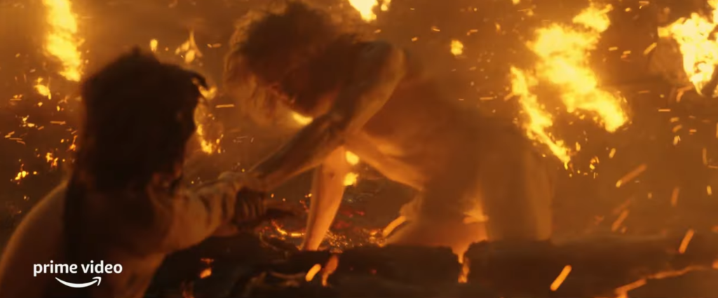 C’è infine un flash molto, molto breve di due figure maschili, una delle quali è mal vestita e potrebbe aver preso consigli di moda da Gollum, anche per la location che sembra quasi il Monte Fato.
