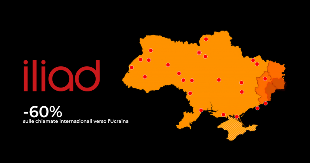 Date le recenti notizie e considerato il valore, in particolare in questo momento, di poter mantenere collegamenti con amici e familiari, iliad ha previsto per tutti i propri utenti una riduzione del 60% della tariffa voce verso fissi e mobili in Ucraina, da 0,57€/min a 0,21€/min. Tale riduzione entra in vigore da oggi e sarà valida fino al 30 aprile 2022.