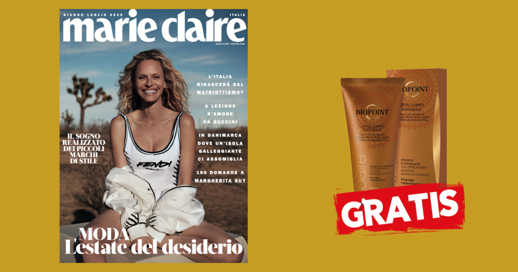 Non perdere in edicola il nuovo numero giugno-luglio di Marie Claire, che ti regala il Latte Corpo Doposole Biopoint!