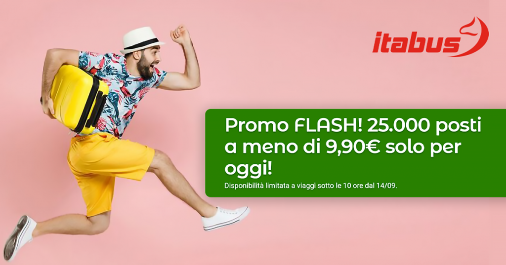 Hai bisogno di una vacanza all’ultimo secondo? Con la Promo Flash di Itabus, puoi acquistare entro stasera biglietti a meno di 9,90€ per varie tratte italiane!