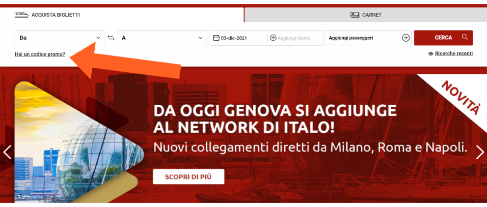 Vai al sito di Italo e inserisci il codice sconto AVVENTO sulla voce “Hai un codice promo?”