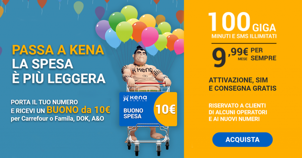 Super offerta di Kena Mobile, operatore virtuale di Tim, che a 10 euro offre 100 giga di internet, minuti ed sms illimitati! Nell’offerta è incluso anche un buono spesa da 10€!