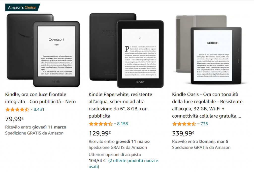 Qua puoi vedere i vari Kindle di Amazon, da quello classico (modello base), che include pubblicità, al modello intermedio Paperwhite al top di gamma che può includere anche la connettività al cellulare.
