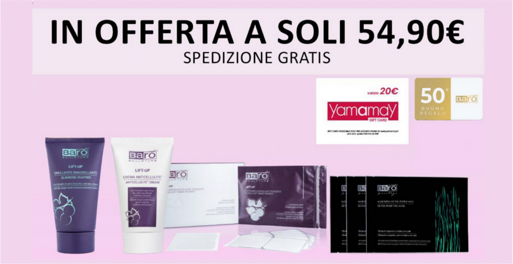 Un mix di prodotti unici e professionali pensati per una beauty routine quotidiana ancora più performante, in grado di regalare alla tua pelle più morbidezza, elasticità e radiosità. Ma il contenuto non termina qui. All’interno del kit in promozione ci sono anche due gift card imperdibili: una di 50€ da spendere nel sito Barò di Cosmetics e una da 20€ per capi di Yamamay.