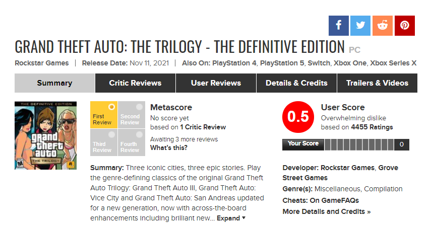 Su Metacritic, con oltre 4400 recensioni, il punteggio di GTA The Definitive Edition resta ancorato ad un umiliante 0.5 su 10. Un disastro completo.