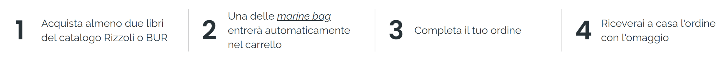 Se, invece, effettui due o più acquisti con almeno 2 libri del catalogo, riceverai due o più Marine Bag in proporzione al numero di spese fatte.