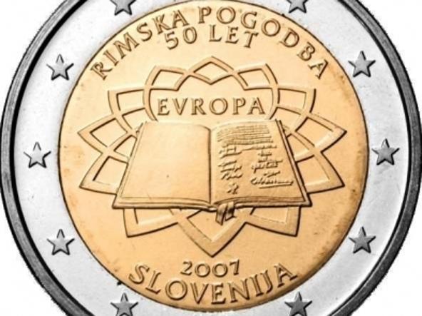 Nel 1957 furono siglati a Roma i Trattati di Roma, pilastri di quella che sarebbe diventata l’Unione Europea. La Slovenia per celebrare i 50 anni, nel 2007 coniò una moneta da 2 euro in 40.000 esemplari. Secondo Flooxer Now, questa moneta celebrativa vale tra i 39 e i 50 euro.