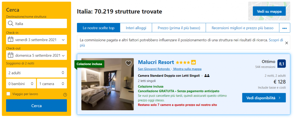 Questo è un esempio per il weekend del 3-5 settembre: camera standard a soli 128€ per due notti. La Suite King sta a 188€ (pari a 47€ a notte a persona per una sistemazione di extra-lusso).