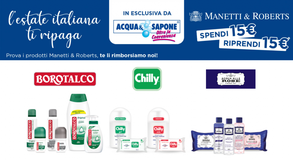 Manetti & Roberts propone “L’estate italiana ti ripaga”, una iniziativa che ti offre la possibilità di ottenere un rimborso completo acquistando 15€ di prodotti convenzionati.
