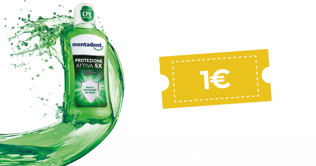 È attiva la possibilità di richiedere un buono sconto da 1€, valido per l’acquisto a prezzo ridotto di un collutorio Mentadent Protezione Attiva 5x!
