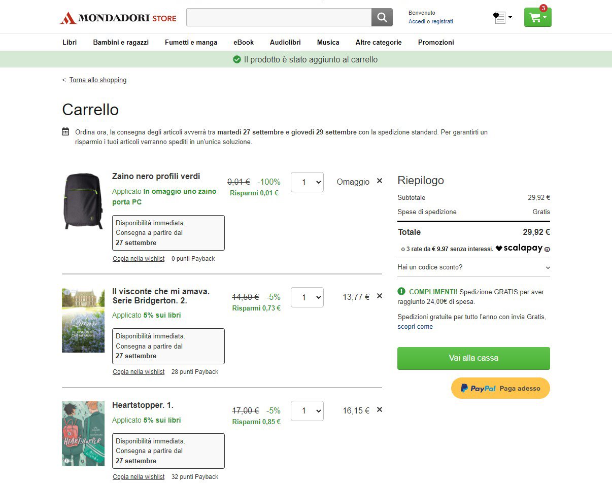 Accedi dunque al carrello e potrai notare che lo zaino è stato aggiunto (e il costo azzerato completamente).