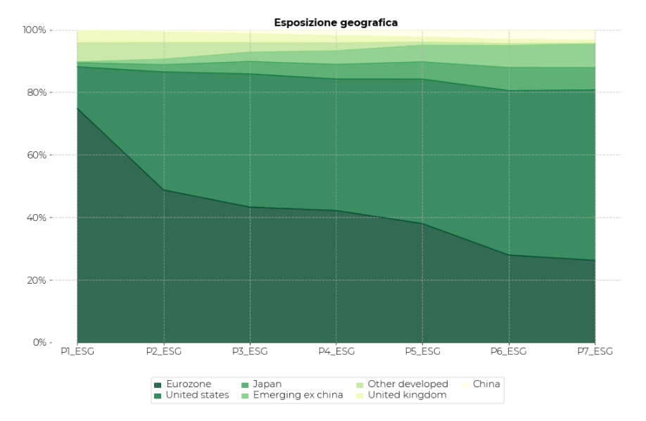 Per quanto riguarda invece l’esposizione geografica, essa dipende dai livelli di rischio associati. Per tutti i livelli di rischio in un portafoglio ESG gli investimenti dalla Cina sono nulli o molto marginali, anche se aumentano con gli ultimi livello di rischio. Per il Regno Unito, vale invece il verso opposto.