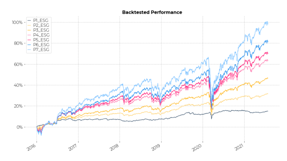 Ecco un esempio dal loro blog relativo a un test che hanno effettuato mettendo a test un portafoglio ESG retrodatato con iniziale investimento dal 2016 ad oggi. La crescita è ottima, con un sostanziale calo a inizio 2020 per la pandemia, a cui è però seguita una crescita.