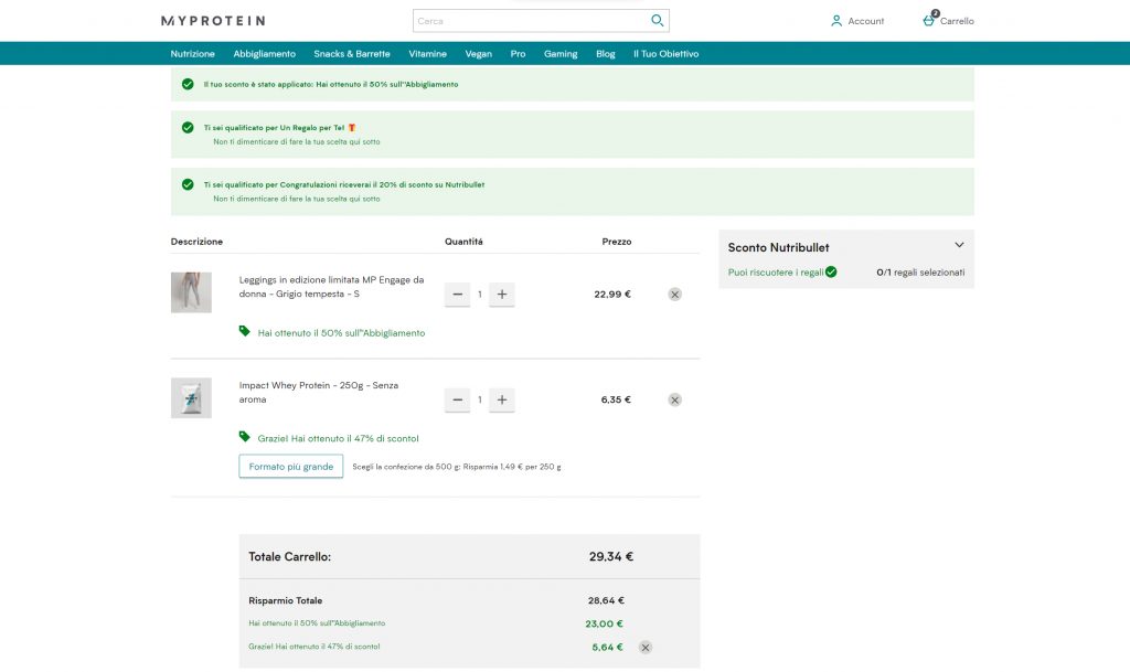 Inoltre, My Protein ti offre la consegna gratuita raggiungendo la soglia minima di spesa di 55€ (con sconti già applicati). Tieni a mente questa possibilità quando andrai ad effettuare il tuo ordine!
